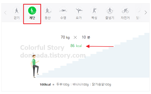 칼로리 계산기에서 '계단'을 선택하고 똑같이 몸무게와 지속시간을 적어 보았습니다.