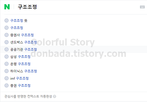 우리나라 역시 구조조정이라고 하면 이미 연관 검색으로 다양한 분야의 구조조정이 시작된 것을 알 수 있습니다.
