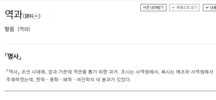 우선 표준어를 관장하고 있는 표준국어대사전에서 역과를 찾으면 아래와 같은 사전적 의미만 덜렁 나옵니다.