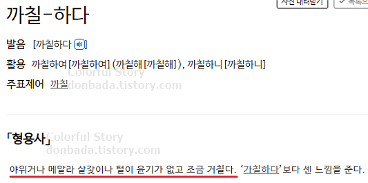 까칠하다 뜻은 야위거나 메말라 살갗이나 털이 윤기가 없고 조금 거칠다는 뜻을 지니고 있습니다. 품사는 형용사입니다. 보시는 것처럼 '가칠하다'보다 센 느낌을 주는 어휘라고 표기되어 있습니다.