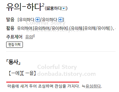 품사는 동사로써, 사전상 유의하다 뜻은 '마음에 새겨 두어 조심하며 관심을 가지다'라는 뜻을 갖고 있습니다.