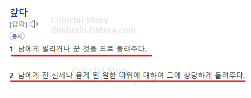 그리고 갚다의 뜻은 앞서 본 것처럼 2가지가 존재합니다.