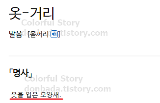 옷거리 품사는 명사이고 옷거리 발음은 [옫꺼리]로 발음이 됩니다. 뜻은 '옷을 입은 모양새'라는 의미를 가지고 있습니다.