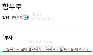 함부로 품사는 부사로써 뜻은 '조심하거나 깊이 생각하지 아니하고 마음 내키는 대로 마구'라는 의미를 지니고 있습니다. 사람의 태도나 습관, 성격 같은 것을 나타내는 말입니다.