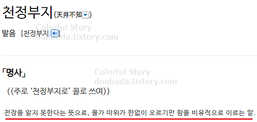 아무튼 천장이 표준어이지만, 천정부지라는 예외가 있다라는 점 꼭 기억해두면 좋을 것 같습니다.