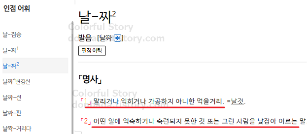 날짜는 동음이의어로 '날'을 의미하는 단어 외에도 '날것'을 의미하는 표제어도 있습니다.